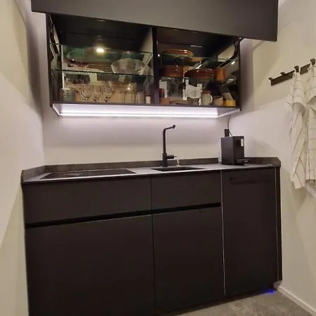 Es gibt eine Küchenzeile mit einem Kühlschrank und einem Geschirrspüler, die für einen komfortablen täglichen Aufenthalt sorgen.